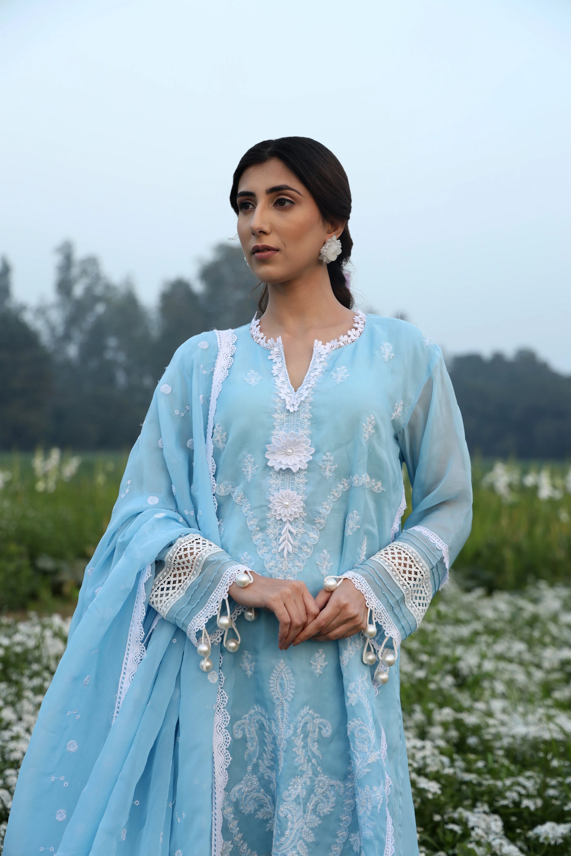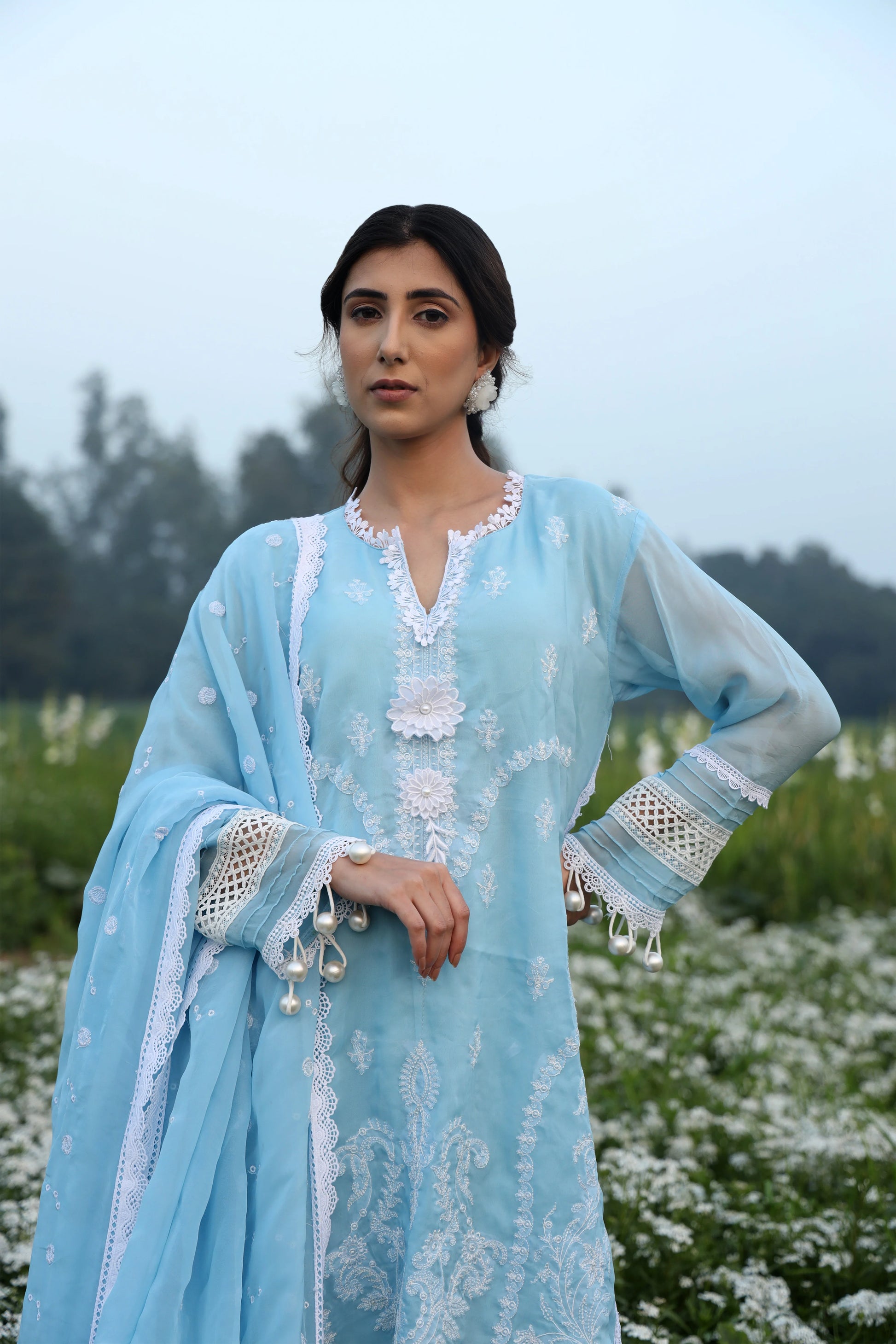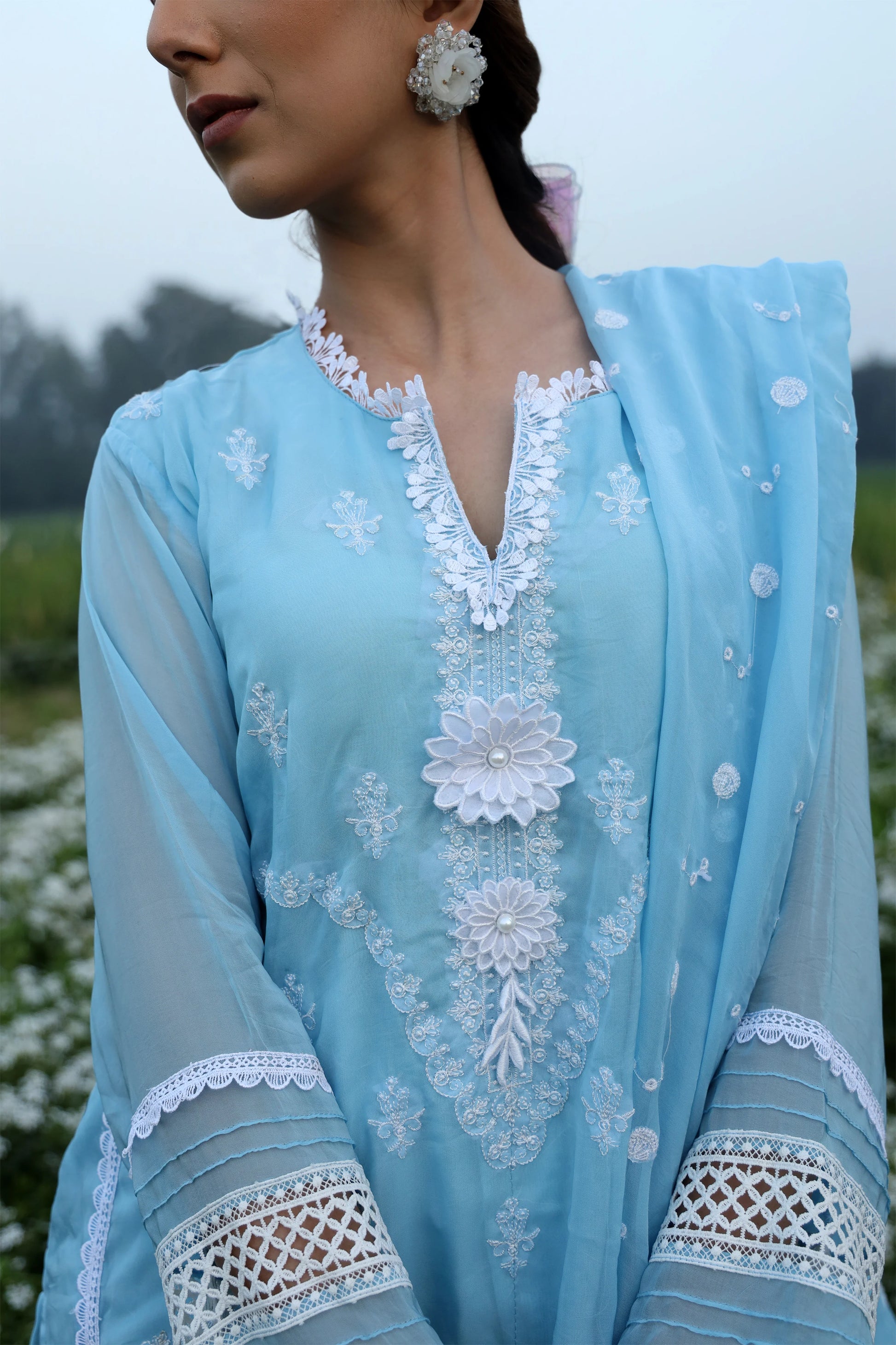 A symphony of heritage and elegance, this embroidered blue suit tells a story in every thread. Adorned with lace and pearls, it blends floral grace with geometric precision—a delicate balance of tradition and modernity.