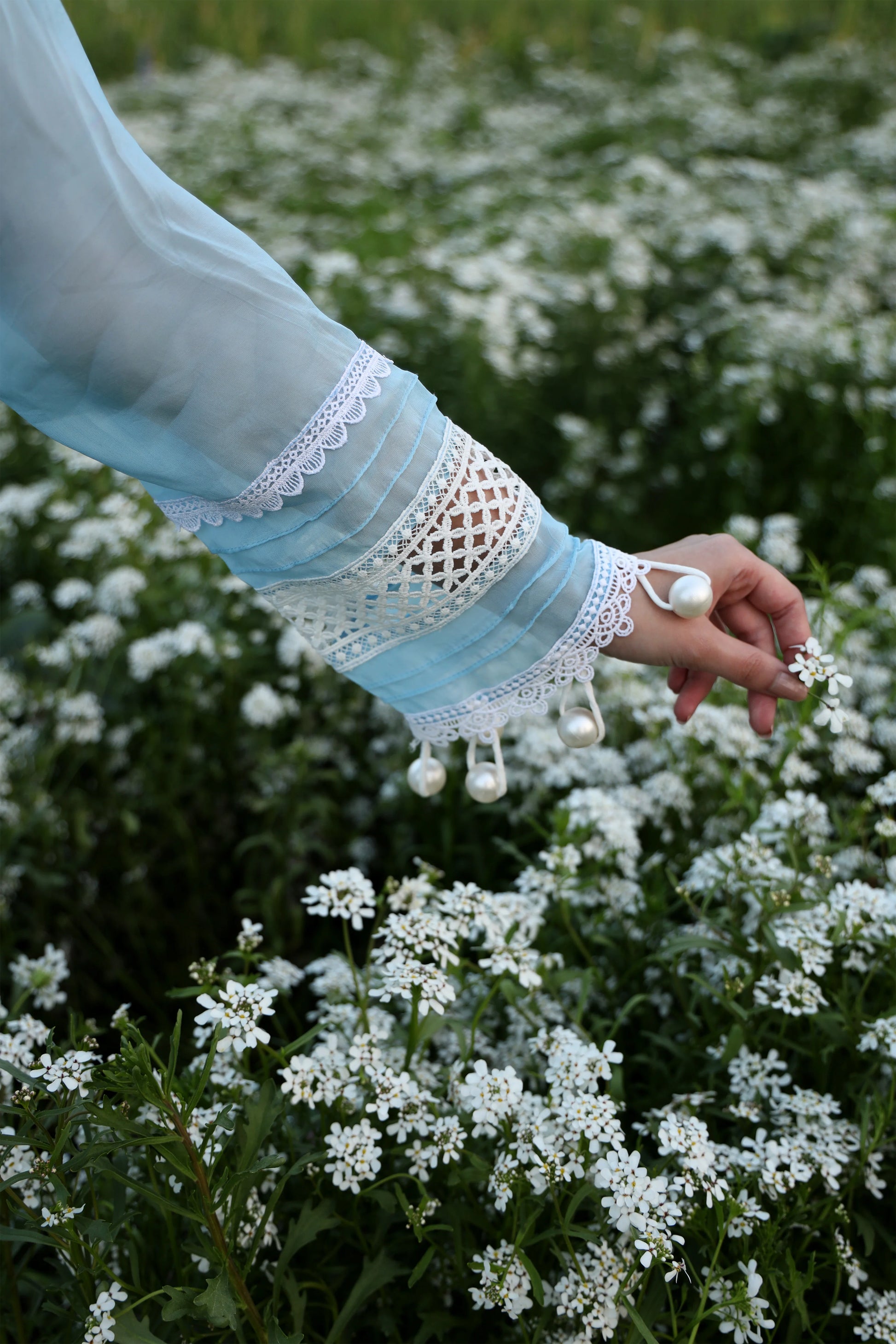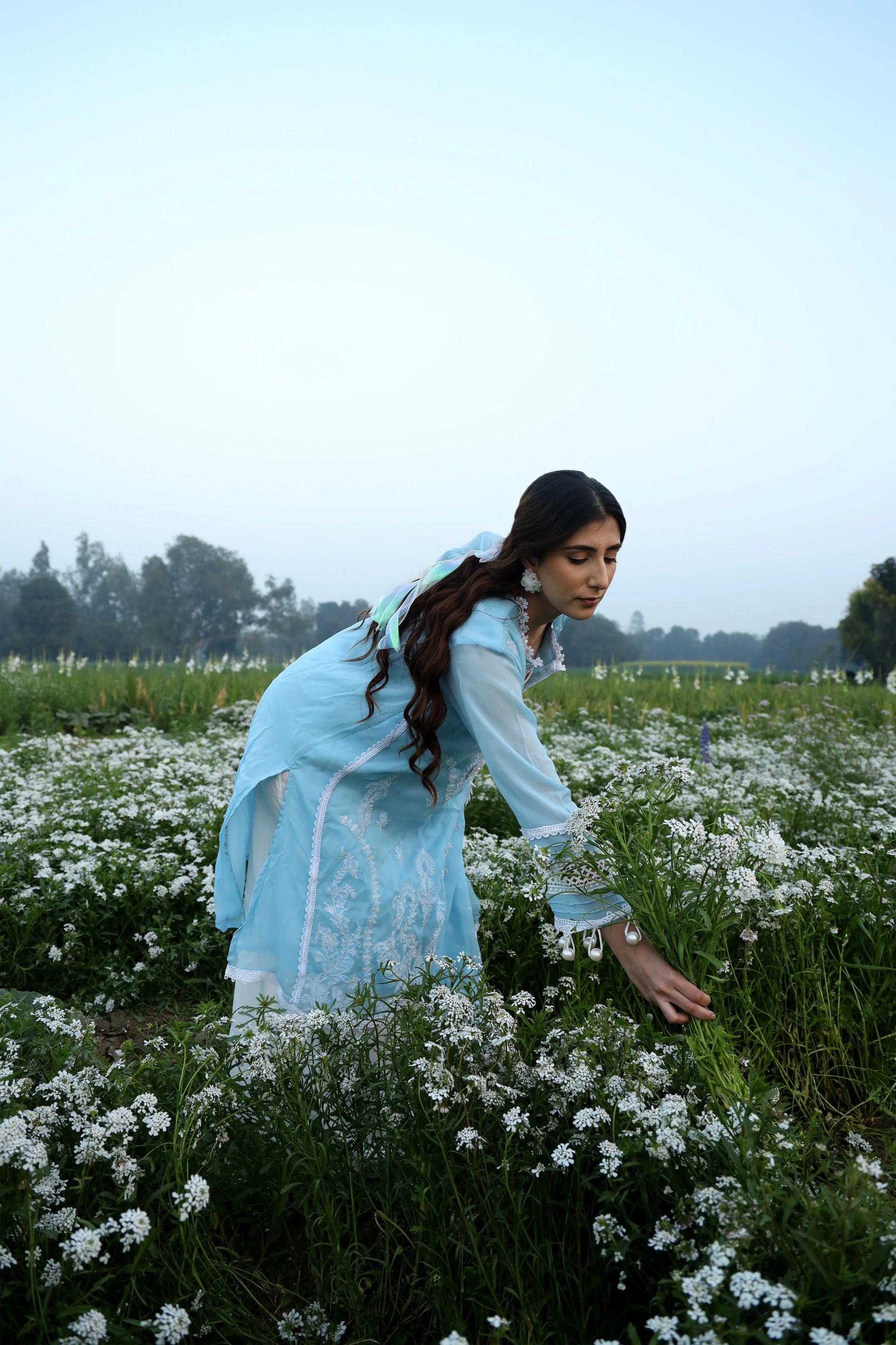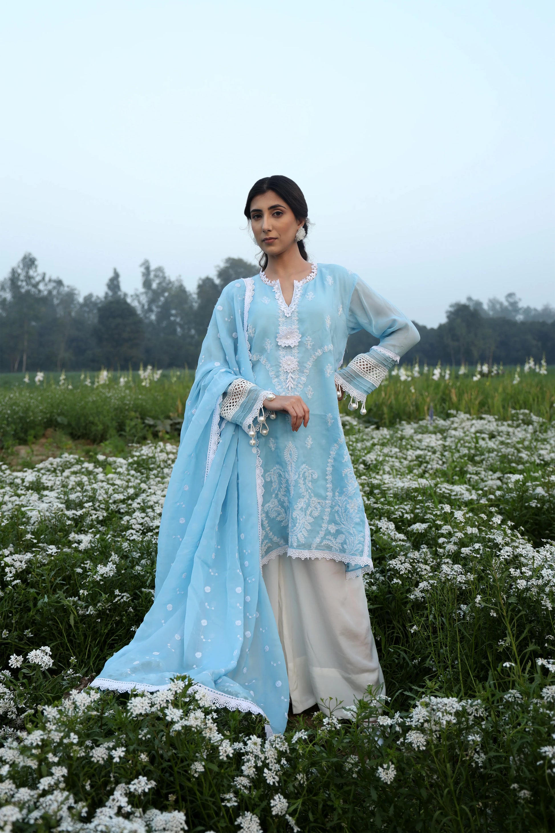 A symphony of heritage and elegance, this embroidered blue suit tells a story in every thread. Adorned with lace and pearls, it blends floral grace with geometric precision—a delicate balance of tradition and modernity.