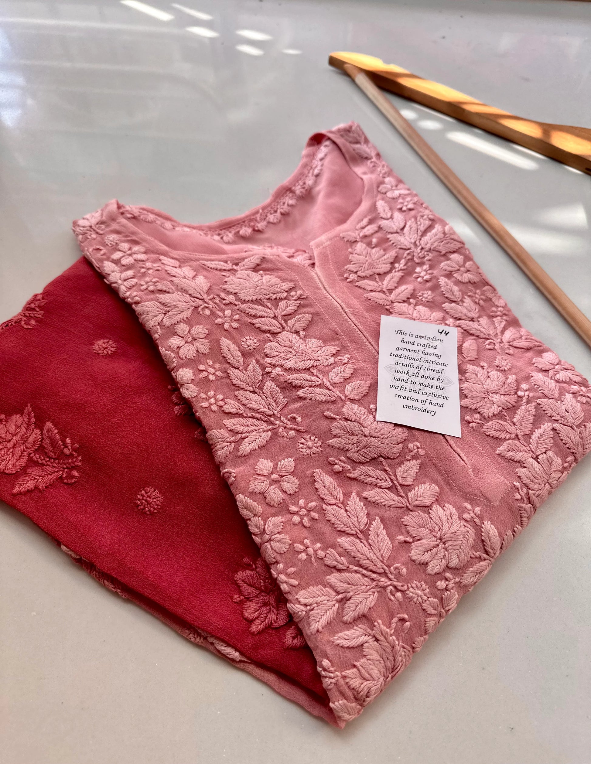 Shop these elegant pure georgette kurtas adorned with fine hand-embroidered chikankari—crafted to bring a festive glow to your wardrobe. Whether you choose a classic single shade or a vibrant dual tone, these kurtas are timeless in every stitch.