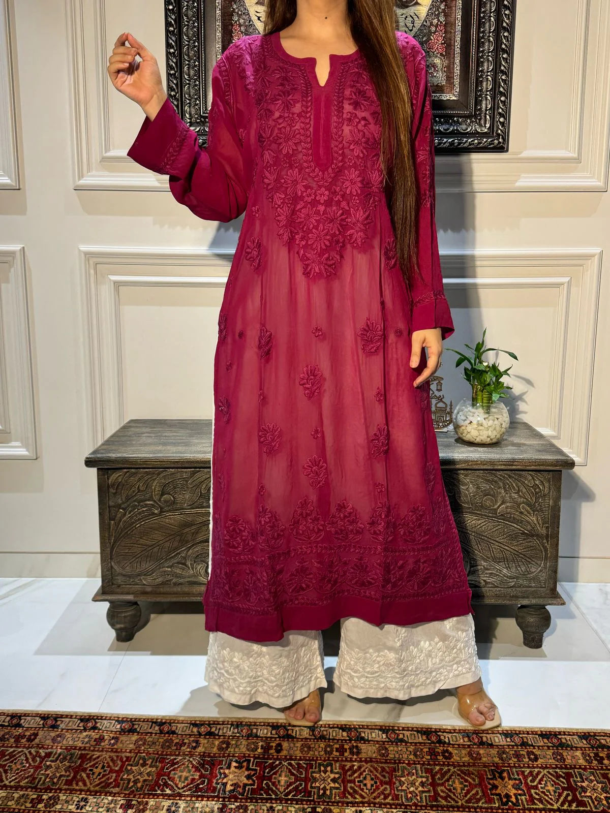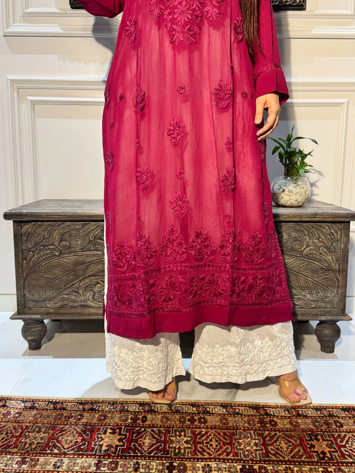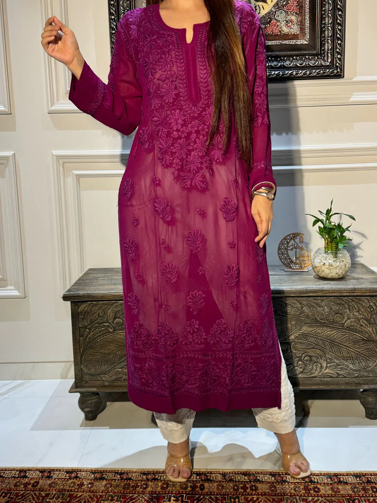 A beautifully handcrafted chikankari kurta in premium viscose georgette, featuring intricate hand embroidery on both the front and back. This elegant piece blends traditional craftsmanship with effortless grace—perfect for festive moments or everyday sophistication.
