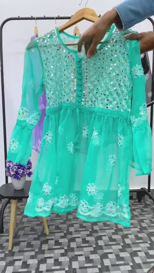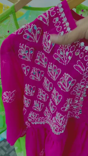 The Chikankari Short Top is a stylish and elegant piece made from delicate Chiffon Georgette fabric with intricate Chikankari embroidery and mirror embellishments. Ideal for special occasions, it comes with a matching inner and can be paired with various bottoms for a chic and sophisticated look.
